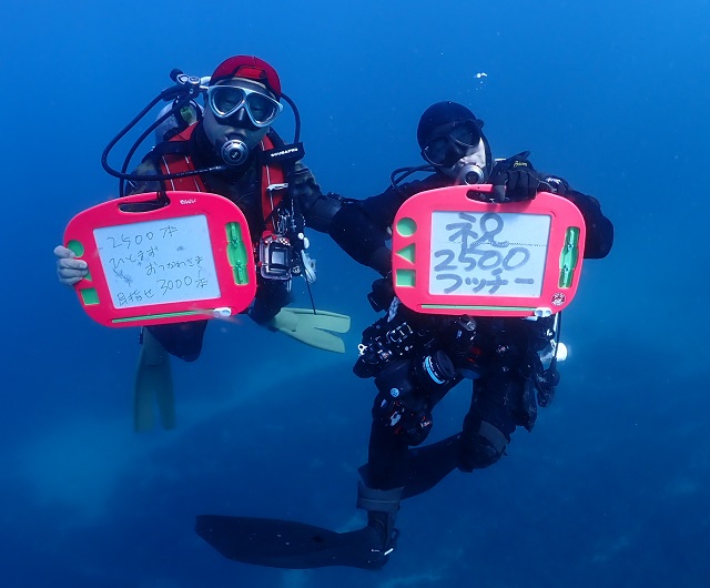 本日は、ご存知の方も多いFさんの2500本記念でした! おめでとうございます~っ!!! その場にいた皆さんが、「すごい~っ!!!」と感嘆の声! 快晴の空のもと、記念撮影してお祝い(^-^) 次は3000本にむかって、楽しく潜りましょう~♪ 素敵な写真、楽しみにしております! ![]() |