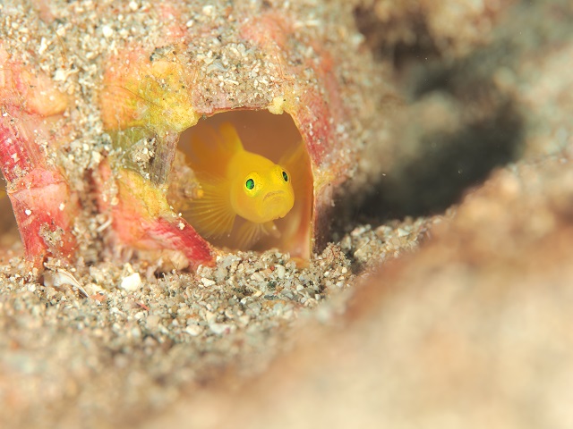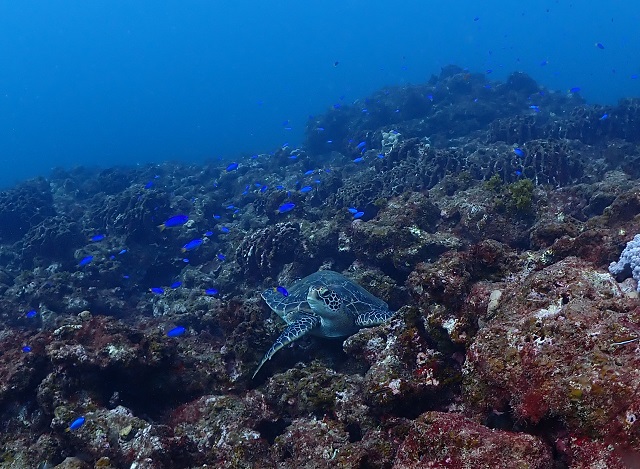 ソラスズメダイに囲まれてのんびりお食事中のウミガメさんでした!