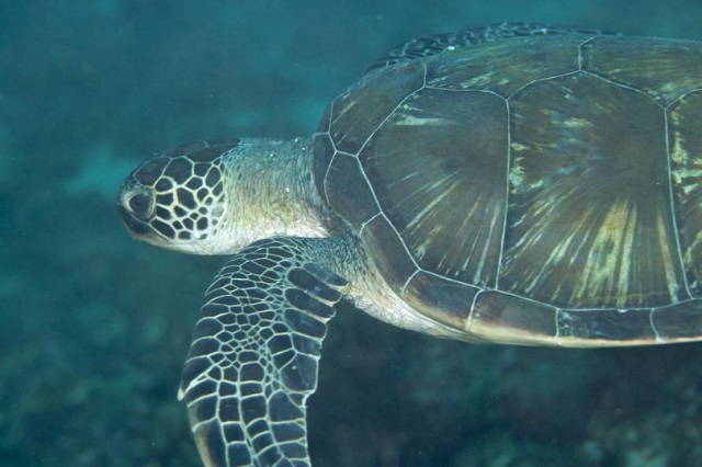 アオウミガメさん、今日も大好きなハマサンゴの下で休憩してました